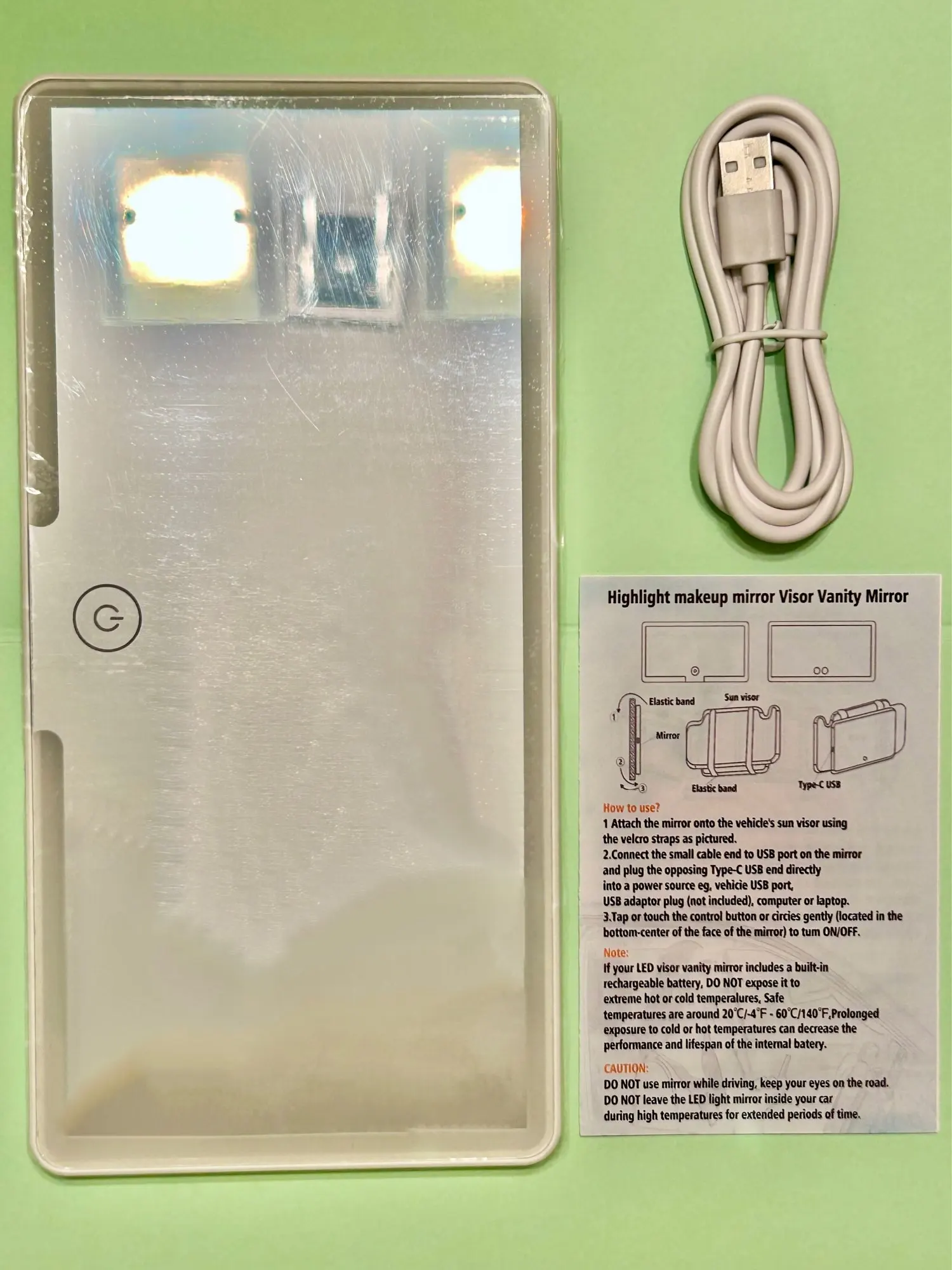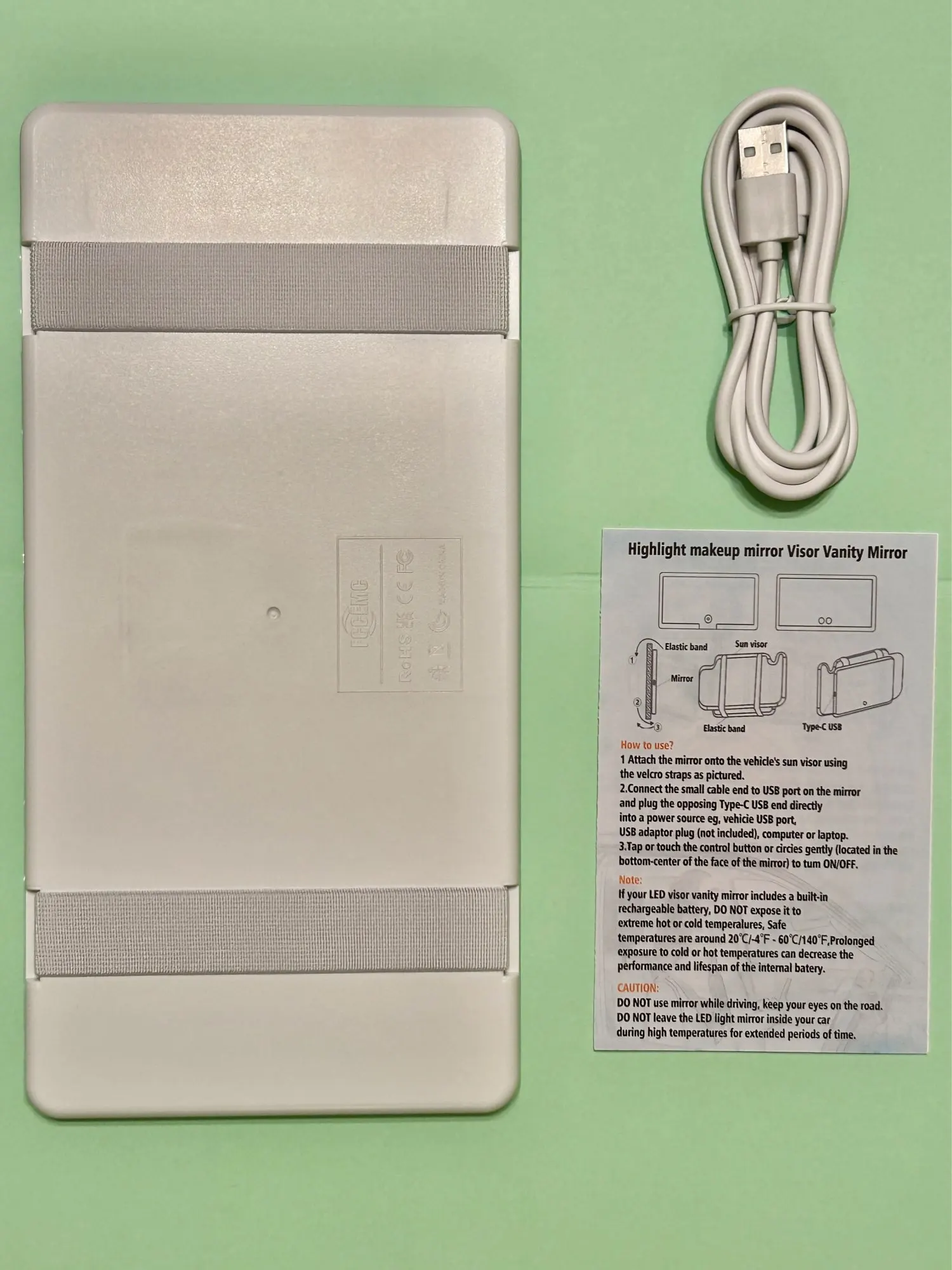 The interior car mirror for makeup is of excellent design, quality, and finishes. It is made of ABS plastic, with resistant elastic bands, and the HD LED light has 3 intensity levels. It is easy to install and comes with a cable for charging. It is faithful to the seller's images. Fast shipping. I recommend the product and the seller.